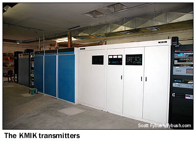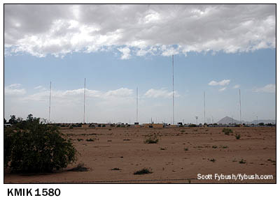 Today, 1230 (shown below at left) is part of the Clear Channel cluster, using the historic KOY calls and running a standards format. After a quick stop at KRIZ/KOY, we zip eastward toward Tempe and a lunch at Ted's Hot Dogs, a Buffalo institution with a branch transplanted here to the desert, and after catching up with some radio friends, we check out the AM sites in nearby Mesa. At Radio Disney's KMIK (1580), we get lucky: the gate's open and contract engineer William MacDonald is on site - and happy to give a quick tour of this six-tower 50 kW plant, which was Buck Owens' KNIX back in the day. About half a mile south of KMIK, there's an interesting and somewhat sad story: KXAM (1310 Mesa), with a two-tower array adjacent to a cemetery, is in its last days of broadcasting on this cloudy April day in 2009. Its owners were then claiming they intended to shut the station down for good, sending some of its unusual independent talk shows to other small AMs in the valley - and indeed, we listened as the plug was pulled "forever" at midnight on April 16. Some endings, however, are more permanent than others: a few months later, the old KXAM facility was revived under new ownership as Phoenix's all-Catholic radio station under new calls KIHP, a callsign that remains in use today.