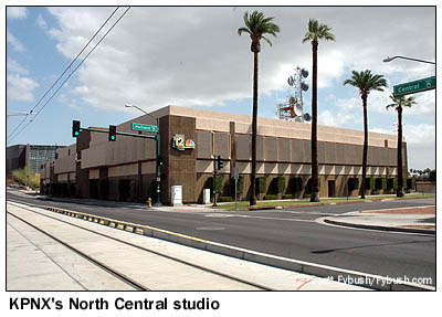 For a city as young as Phoenix, there's quite a bit of interesting broadcast history to be seen downtown: a few blocks up North Central Avenue, for instance, the historic home of KOY, one of the city's oldest stations, still stands - but KOY is nowhere to be found here these days. The old "KOY Building" is now the "KOOL Building," housing CBS Radio's KOOL-FM (94.5) and KMLE (107.9) behind a new facade that went up here in the 1970s, covering up what was once some fine broadcast Art Deco, or so I'm told. The KOY/KOOL building sits almost directly across the street from another older building with a new facade: the erstwhile "KTAR Building" lost its radio occupant when KTAR (620/98.7) split off from KTAR-TV (Channel 12) in the seventies, with the TV station becoming KPNX and remaining here at 1101 North Central (at least for now; Gannett, which owns both KPNX and the Arizona Republic, is reportedly planning to move the TV station in with the newspaper.)
