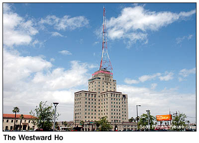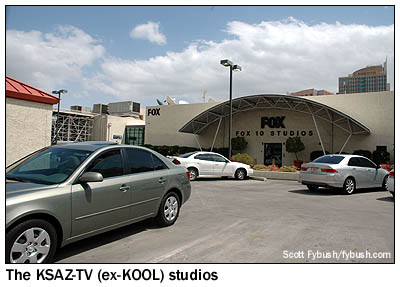 Arizona State University recently moved its Cronkite School of Journalism from suburban Tempe to downtown Phoenix, and that meant a shift of locations for its public TV station, KAET (Channel 8) - which now sits just a few blocks from one of Phoenix's oldest TV sites. The Westward Ho hotel was the original studio and transmitter location for KPHO-TV (Channel 5), as well as the studio of KPHO (910), and the old TV tower still sits prominently atop the roof, which should look familiar if you're a Hitchcock fan, since the Westward Ho was the setting for the opening scenes of "Psycho," before the action moved to the Bates Motel. (The former KPHO radio, later known as KFYI, stayed put in the vicinity of the Ho, operating from studios next door at 631 N. 1st Ave. until just a few years ago.) A few blocks west, at 511 W. Adams, we find another venerable Phoenix broadcast site. Gene Autry's KOOL radio and TV boasted some of the biggest TV studios in the west at this location, and while KOOL radio has long since moved away (the AM station at 960 is now Salem's KKNT, which we'll see next week, while KOOL-FM on 94.5 is now in the old KOY building), the former KOOL-TV on channel 10 is still here, now as Fox O&O KSAZ-TV occupying almost a full city block behind a high wall.