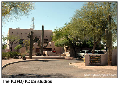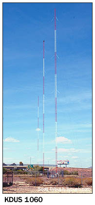 And we wrapped up our whirlwind two-day swing around Phoenix with a stop in Guadalupe, a small neighborhood tucked around to the southeast of South Mountain, where I-10 takes off for the long ride south (though it's marked as "east" on the highway) down to Tucson. Just off the side of the freeway is the three-tower array of KDUS (1060), the Tempe-licensed sports station that's part of the Sandusky Radio cluster here. Its studios, and those of its sister FM station KUPD (97.9), are in a Southwestern-themed building next door to the towers - and yes, the old KUKQ calls for the AM are still on the sign out front! In next week's installment, we get started on a look at the towers of Tucson, a brand-new market to Site of the Week - and in the meantime, check out our Phoenix IDs (and those of fellow traveler Garrett Wollman) over at TopHour.com! - Find out when the new Tower Site is posted,