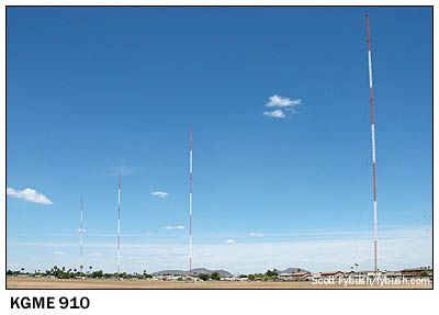 One of the arrangements between the broadcasters and the city provides that no more towers can be added to South Mountain, so any new tower that goes up must replace an existing tower that's removed. That's how KTVK, for instance, got a new tower built when it put KASW on the air in the nineties: it dismantled a much older auxiliary Channel 3 tower in the process. And when you're up this high already, there's not much need for really tall towers: the very tallest stick up here, at 416 feet, is the KZON (101.5) tower. Ten others top 300 feet tall, with the rest considerably shorter. After South Mountain, the rest of Phoenix's broadcast lineup is a little less exciting, but we've still got the better part of a day to see more of the sites, including a few more of the many directional AMs that dot the valley. KGME (910) is the descendant of the old KPHO radio, and it's been at its present site on West Maryland Avenue, just west of the I-17 freeway, since long before there was an I-17 freeway. This four-tower array runs 5 kW fulltime, directional only at night, and it dates back to KPHO's 1949 move from 1230 to 910. The previous KPHO 1230 site at 2400 W. Buckeye remained in use after the move, and you saw it in last week's installment - it became the legendary KRIZ, and is now KOY, a sister station to KGME under Clear Channel.