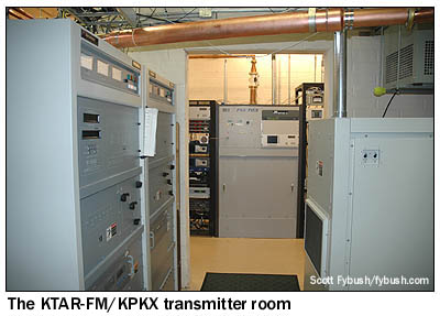 We're up here in the company of an engineer from Bonneville, and that means we get to peek inside at least one of the buildings on the mountaintop: the one that's home to KTAR-FM (92.3) and sister station KPKX (98.7). To fit two class C FM stations - with HD, no less - in a space originally designed for just one took some ingenuity. The combiner system for the analog and digital transmitter systems is hung from the ceiling, and the reject loads for the excess digital power ended up on the roof for lack of a better location.