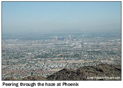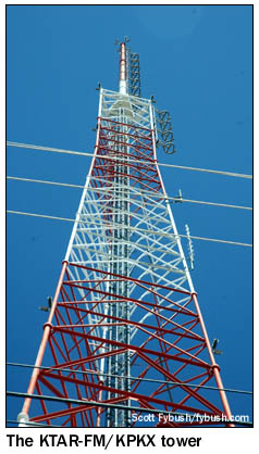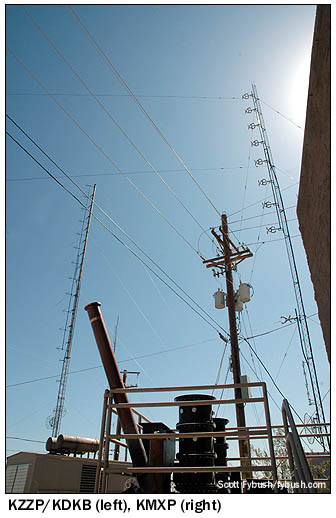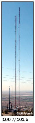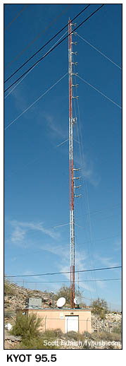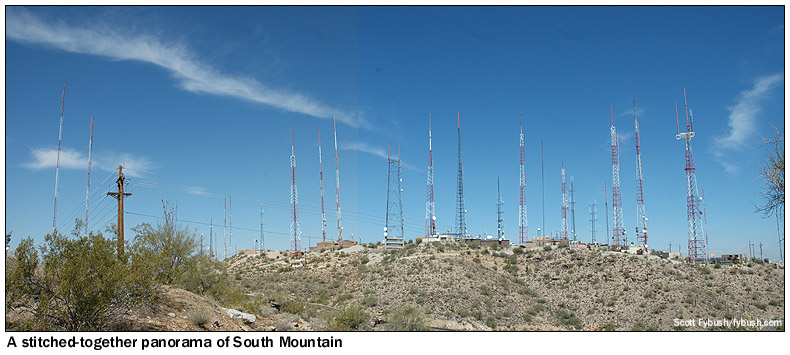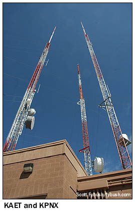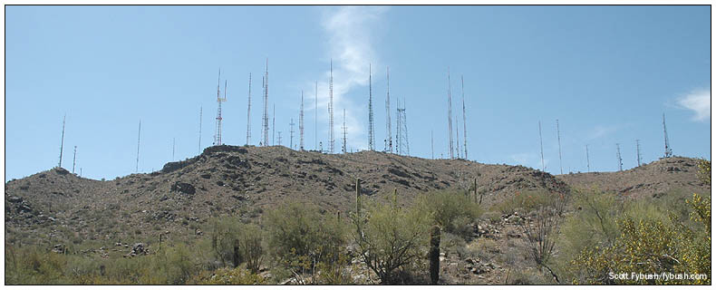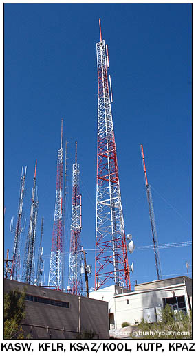 ![]() July 30, 2010 Phoenix, 2009 (part III) Last fall, as we featured the sites pictured in Tower Site Calendar 2010 (still available in very limited quantities!), we showed off the fascinating history of Phoenix, Arizona's KTAR, with a promise that it would eventually be followed by the rest of the pictures from our April 2009 visits to Phoenix, Tucson and Yuma, Arizona. It took a little longer to pull all the pieces together than we'd anticipated, but this week's Site of the Week brings you a look at one of the finest tower farms in America. South Mountain rises 2660 feet above sea level and more than 1500 feet above downtown Phoenix, providing a vantage point for FM and TV transmission unmatched by any other site in the market. It's no wonder that TV stations began locating up here early in the market's broadcast history, nor is it any surprise that today South Mountain's 23 broadcast towers are home to nearly all the TV and major FM signals in Phoenix: 14 full-power class C FMs, another lower-powered noncommercial FM, several FM translators, 12 full-power TV stations and a slew of low-power TVs. ![]() That's the view from the north, as we approach the top of the mountain on the nicely paved road that leads right to the transmitter-site gate (and how convenient is it that South Mountain is part of a city park, making access to this site about as good as it gets anywhere in the west?) ![]() And that fine view above is the panorama from the south, looking over to the tower farm from a nearby parking lot at the top of the public road up the mountain. At the left is the outlier cluster of towers here, the pair of sticks just south of the main ridge belonging to KSLX (100.7 Scottsdale) and KZON (101.5). From left to right, here's how the main ridge of towers shapes up: there are several shorter towers used by government agencies, then two shorter (243' and 240') guyed FM towers, one used by KUPD (97.9 Tempe) and KNIX-FM (102.5), the other by KJZZ (91.5). The painted self-supporter next in line is the KTAR-FM (92.3 Glendale)/KPKX (98.7) tower, next to two painted, guyed towers home to public TV KAET (Channel 8) and NBC affiliate KPNX (Channel 12/RF 36), the erstwhile KTAR-TV. That fat tower at the center of the picture is one of the newer towers on the mountain, home to ABC affiliate KNXV (Channel 15) and Univision's KTVW (Channel 33). Next to the right (that would be heading east) is indie KTVK (Channel 3/RF 24) and its newer sister station, KASW (Channel 61/RF 49). The KTVK tower is also home to Telemundo's KDTP (Channel 39). Moving east, there's a short tower that's home to KFLR (90.3), then the taller self-supporter of KSAZ-TV (Channel 10/RF 31) and KMLE (107.9 Chandler), part of a compound of towers that also includes KOOL-FM (94.5) and an aux tower for KSAZ. Among the antennas on the shorter towers to the right of the KSAZ aux is one for TBN's KPAZ (Channel 21/RF 20) - and then we get to the last set of tall towers on the mountain: My Network outlet KUTP (Channel 45/RF 26), CBS affiliate KPHO-TV (Channel 5/RF 17) and the candelabra that's home to Ion's KPPX (Channel 51). They're not clearly visible to the right of the candelabra, but there are shorter towers at this end of the mountain for the remaining FMs: KYOT-FM (95.5), KMXP (96.9) and KZZP (104.7 Mesa)/KDKB (93.3 Mesa).