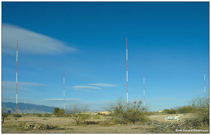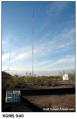 ![]() August 20, 2010 Tucson, 2009 (Part I) ![]() This week's installment marks two beginnings here at Site of the Week: it's the first of two installments of pictures from a brand new market to us - Tucson, Arizona - and it's the first in an ongoing series of Site of the Week installments showing off the images you'll see when you order Tower Site Calendar 2011, which is at the printer right now and will be shipping beginning right after Labor Day. That picture at the top of the page is our May 2011 calendar picture - and while it might look like nothing more than five average guyed towers (and a graffiti-scarred dead sofa!) in the midst of some desert scrub, it means much more to anyone who's familiar with the history of top-40 radio. Unlike so many other formats, the roots of top 40 were in smaller markets. Before there was a WABC or a KHJ or a WLS, there were incredibly influential, inventive stations such as KOWH in Omaha, KYNO in Fresno...and KTKT in Tucson. At its beginning in 1949, KTKT was indistinguishable from the thousands of other little independent radio stations that sprung up after the war: 250 not-so-big watts on 1490, the fifth station in what had already been a pretty crowded little four-station market. (Tucson was a small town back then, with just 45,000 people in the metro area in 1950!) But little KTKT grew - it moved down the dial to 990 and cranked up the power to 10,000 watts, at the expense of going daytime-only. And in May 1957, it gave a young DJ named Frank Kalil the go-ahead to change format, flipping from all-over-the-road to straight-ahead top-40. For the next two decades, "Color Radio 99" would be one of the most influential top-40 stations in this part of the country - and long after the music stopped playing, the towers off West Grant Road were still standing, and still on the air with the KTKT calls, when we parked ourselves in a nearby motel one April evening in 2009. Today's KTKT is an ESPN Deportes outlet, and it's once again a fulltimer, operating with four of those five towers by day and a somewhat different four-tower array at night.