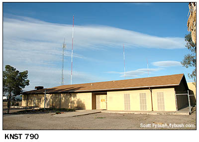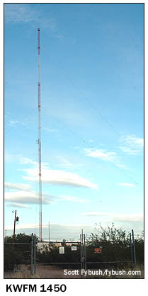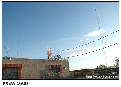 From our motel on West Grant, just across I-10 from downtown Tucson, it was a quick drive to several other AM sites on the west side of town. On Silverbell Road, almost within spitting distance of the KTKT towers, we found the three towers of KNST (790), now Clear Channel's news-talker. That building at the base of the array is shuttered now and used only for the AM transmitter, but it was once a thriving studio facility for both the AM station (under its old calls, KCEE) and eventually a sister FM, KWFM (92.9). (This is my cue to credit the source for much of this information: Barry Mishkind is not only the proprietor of the Broadcaster's Desktop Resource, a wonderful place for broadcast history and current information - he's also a longtime Tucsonan, veteran of many of these stations and maintainer of a very nice page of Tucson radio history at his site!) The KNST calls that now live on 790 used to be on the next AM station to the south, at 940 on the dial. This two-tower array off Greasewood Road and San Juan Trail in southwest Tucson started out in the sixties as KHOS, an early country station; it later inherited the KCEE calls from 790 and eventually went religious under its current calls, KGMS. There's one more AM station west of I-10: KXEW (1600) was the first Spanish-language station in town, drawing its callsign from Mexico City's biggest AM station. Its two-tower array lacks the punch of XEW's 250 kilowatts south of the border, but its central location just off I-10 on El Puente Lane still does a nice job of covering the city. The KWFM calls that used to be on 92.9 are still in the Clear Channel family, but they're now on a small AM signal. KWFM (1450), with a lonely little tower off E. 28th Street in a run-down part of the city, now does automated oldies - but back in the day, this frequency was a much more important player in town: it was KOPO, part of the Gene Autry empire and a sister to Phoenix's famous KOOL. KOPO begat KOPO-TV (Channel 13), which eventually became today's KOLD, and the radio station used to be located behind the TV studios near downtown.