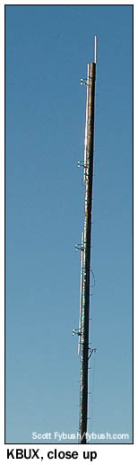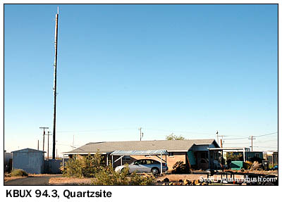 From Blythe, it's only 20 miles or so east on I-10 (which shares the routing with US 95 briefly here) over to Quartzsite on the Arizona side, and as we're making that short drive, we're not sure we're going to find a station on the air when we get there. KBUX (94.3) in Quartzsite is a class A station, but it's not until we pull up in a modest neighborhood on the north side of town that we realize just what an interesting station we're dealing with. For KBUX, you see, is one of that very rare breed of mom-and-pop stations that are literally run out of spare bedrooms. Buck and Maude Burdette put KBUX on the air here in 1988, and since Buck's death in 2003, Maude Burdette has been running the station more or less solo from here. It's a station that wouldn't work most other places - but when you consider that Quartzsite is populated mainly by elderly snowbirds spending the winter months in small homes or RVs, the KBUX music mix of old-time country, standards and beautiful music seems to fit perfectly with the market. (The KBUX website claims that Quartzsite's year-round population, pegged by the Census at somewhere south of 4,000, swells to "between 750,000 and 1,000,000" when the snowbirds and gem collectors converge during the annual Gem and Mineral Show in February; that figure seems rather high from where we sit.) In any event, KBUX's mighty 205 watts/-161' from the telephone pole next to the Burdette home blankets the little valley where Quartzsite sits, and even if it doesn't get too far north as we head up Arizona 95 out of town, it's pleasant company for us, and probably for all those RVs baking in the sun along the roadside as we head up to Parker.