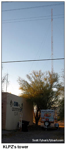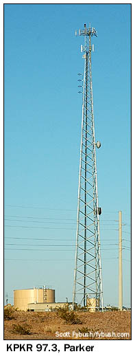 Today, KLPZ runs 2500 watts by day, 58 watts at night from its single tower next to the studio building on 6th Street, a few blocks north of downtown Parker, mixing country music with local talk. KLPZ never added an FM station, though frequencies aren't hard to find here: there are three other FMs serving Parker, or at least there would be if all of them had been on the air this April Saturday afternoon. On the way up 95 into Parker from the south, we passed by the cell tower on a hill southeast of town that's home to KPKR (97.3). "River Rat Radio" signed on in 2008, playing classic rock on a 1.7 kW/928' C3 signal that gets up and down the river to reach almost to Blythe to the south and into Lake Havasu City to the north.