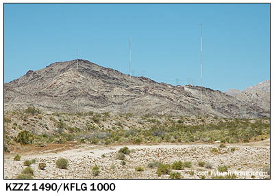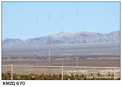 As new as KNTR is, we've got two even newer AM sites to show you as we complete the Yuma-to-Vegas haul. Heading north in the dark after a late dinner in Lake Havasu City, we stop for IDs in Needles before finishing up a long Saturday of driving in Laughlin, Nevada. That casino town at Nevada's southernmost tip didn't even exist until 1964, and it wasn't until 1986 that it got a radio station. KROL (870) signed on with 10 kW days/1 kW nights from a three-tower site just west of the casino strip along the river in Laughlin, soon sharing its array with Bullhead City-licensed daytimer KRHS (1000). But the 870 facility eventually spawned an on-channel booster 90 miles north in East Las Vegas, and then migrated completely to the Vegas market, where it's now KLSQ (870 Whitney). The towers stayed behind, and today they're home to 1000 (now KFLG) and now to Bullhead's other station as well. What's now KZZZ (1490) started out in 1981 as KBAS, and its old site on the hill above Bullhead City, just across the river from Laughlin, is notable in TSoTW lore as the spot where we got a rental car stuck on a rock in the dark almost a decade ago. (That once-remote spot has now been paved over for the new parkway that loops around Bullhead and over the new bridge to Laughlin, which probably explains KZZZ's move across the river to the Laughlin site.) One final stop on Sunday morning completed this trip for us: before settling into the hubbub of the NAB Show, we made time to go north of Las Vegas to see the city's newest AM site. KMZQ (670) signed on in the summer of 2008, running 30 kW days and 600 watts at night from this four-tower array on tribal land along US 95 some 20 miles north of the Strip. And in the meantime, we're now shipping Tower Site Calendar 2011 to those lucky folks who've pre-ordered...and to you, too, if you get your order in quickly. We'll have lots of Havasu/Laughlin/Bullhead IDs for you to listen to starting October 6 over at sister site TopHour.com, too! - Find out when the new Tower Site is posted,