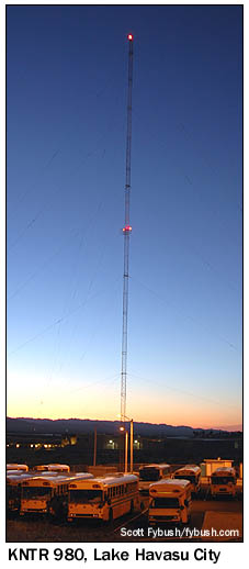 And there's a noncommercial station here: KWFH (90.1), at the Parker Community Lighthouse Chapel just a few blocks away from KLPZ, signed on in 1984, and today its 460 watt/-164' signal here is just one part of the "Alive FM" network that extends from Parker to translators in the much faster-growing string of resort communities that start in Lake Havasu City, 25 miles north of here, and extend up from there to Bullhead City, Laughlin and Kingman. The growth of those towns - and of course the explosive growth of Las Vegas, another 100 miles or so further north - led to a decade or so of hopscotching station moves that yielded a batch of Las Vegas move-ins and a nearly-complete reshuffling of the Lake Havasu/Bullhead/Laughlin/Kingman FM dial. One such move a couple of years ago sent KFLG-FM (94.7) all the way south from Kingman, Arizona to Big River, California, a tiny town across the river from Parker, though the station's transmitter site only moved as far south as Lake Havasu City. (That move allowed KVBE 94.5 to slide in toward Las Vegas as a north-side rimshot, much to the delight of dance-music fans on message boards everywhere.) KWFH holds an as-yet-unbuilt CP to move to 90.3, upgrading to 20 kW/873' and adding coverage north to Lake Havasu; KPKR may eventually slide to 95.7 to make it possible to upgrade a vacant FM allocation to the south at Blythe, but that proposal is hung up awaiting Mexican regulatory approval. And rather than spend any more time in Parker pondering those questions, we chose to chase what was left of the day's light, continuing north on Arizona 95 to Lake Havasu City. That planned community (founded 1964) is home to the strange tourist trap that is the relocated London Bridge; it's also where we find KNTR (980), the town's first radio station (circa 1970), transmitting from a tower next to the school bus yard right down by the river north of the bridge. (The bridge, incidentally, doesn't span the river itself; it's actually a fairly little thing that crosses a man-made channel to a little spit of land extending into the river.) With a little more daylight in Lake Havasu, we'd have spent some time chasing some of the other sites around town. KNTR is the only AM (and it's now on an FM translator at 97.1), and the rest of the market is very much an FM market, and an odd one at that: there are nine or ten primary stations spread out among Lake Havasu City, Needles, Bullhead City/Laughlin and Kingman, with oodles and gobs of translators carrying each station from its own hometown into the other cities. At some point, we'll have to get back down this way to see the FMs up above Lake Havasu City at Crossman Peak (that would be the aforementioned KFLG-FM 94.7, as well as KRCY-FM 96.7, which was once "KBBC" in honor of the bridge; KRRK 101.1 and KZUL-FM 104.5, plus a bunch of translators), as well as the in-town translators and studios.