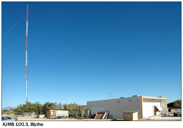From Phoenix, it's barely two hours of freeway driving west on I-10 to reach the small town of Quartzsite, Arizona; from Los Angeles, it's less than four hours (give or take traffic) east to Blythe. But the real way to experience the remoteness of this odd little corner of desert America, I think, is to drive it at a right-angle to the interstates - which is just what we did in April 2009, heading north from El Centro and Yuma to an eventual arrival at the NAB Show in Las Vegas, four hours and a world away from Blythe, Quartzsite, Parker and the other little communities you'll see in this week's Tower Site installment. Coming up from Yuma, the quickest way north would have been to stay on the Arizona side of the river, following US 95 some 84 miles north to Quartzsite, where US 95 crosses I-10; avoiding the obvious route, we cut up the California side, following county roads north past the Black Mountain TV tower farm to pick up California 78 into Blythe. This small town just west of the river had radio as far back as the late forties, when KUCB signed on with a mighty 250 watts on 1450. Even then, Blythe was mainly a stop on the big east-west highway (then US 60/70 in those pre-Interstate days), but the little radio station here soldiered on, eventually changing calls to KYOR and adding an FM outlet on 100.3. The stations changed calls to KJMB/KJMB-FM in 1981, and the AM station left the air for good sometime afterward, leaving KJMB as an FM-only operation. And so it remains today, cranking out 36 kW/56' of what sounded to us like mostly-automated AC music from this facility at 681 N. 4th Street, at the end of a long dirt driveway that stretches over an irrigation canal to get here. I believe this was the AM site as well, back in the day.