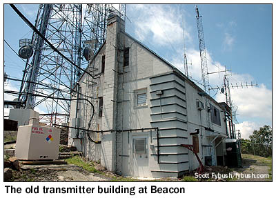 But what makes Mount Beacon really interesting, beyond the million-dollar view up and down the Hudson River, is the history. Today's engineers bump their way up a winding dirt road past a reservoir to get to the transmitter sites up on the north summit of Beacon, but they're following paths that go back to the Revolutionary War era, when the signal fires that were set up here could be seen as far away as West Point. In the early part of the 20th century, there were resort cottages and a hotel up here, served by the Mount Beacon Incline Railway, which shot straight up the west flank of the mountain at as much as a 65% grade. (It ran until 1978, was destroyed by fire in 1982, and is now the subject of a restoration effort; check out the link above to learn more.) And in 1928 it became home to a radio station. In those early days of broadcast engineering, it seemed logical enough that a spot like this, with that view up and down the valley, would be a good place to put a transmitter, so it must have been something of a disappointment when WOKO, which had been slowly migrating north from New York City to Peekskill since its founding in 1924, signed on at 1440 kilocycles from its new longwire antenna strung between two towers amidst the cottages here. The view might have been great, but the ground conductivity up on the rocky mountaintop was not, and WOKO's 500 watts didn't go as far as expected. WOKO tried valiantly, carrying CBS programming to the mid-Hudson region and even experimenting with some very early television transmissions, but by 1930 it was on the road again, relocating 90 miles north to Albany, where it settled down at 1430 (and later 1460) on the dial. (Its history after that remained quite interesting; its license was revoked after the FCC found that a CBS executive, Sam Pickard, had been given a partial ownership share in the station in exchange for the network affiliation. WOKO stayed on the air with a new license and new owners, and is today Radio Disney's WDDY.)
