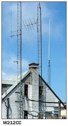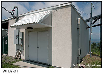 Two TV stations came to the mountaintop in the digital age: Trinity Broadcasting Network's WTBY-DT (Channel 54/RF 27) had operated in analog from Illinois Mountain in Highland, across the river to the west and about 15 miles north; it set up its digital transmitter in a new building next to the old steep-roofed WHVA/WSPK building (which may even have been the original WOKO building, though I've also heard otherwise) and installing its antenna atop an SBA-owned tower here. (In the big picture at the top of the page, WTBY-DT is just to the right of the big guyed Archdiocese/WSPK tower.) The other TV station up here is WRNN-DT, which today is mostly infomercials but once tried to be an all-news channel for the Hudson Valley. WRNN descended from WTZA (Channel 62), licensed to Kingston and transmitting from Overlook Mountain north of Woodstock; its digital operation on RF 48 comes from the basement of the WHVA/WSPK building, with an antenna on another SBA tower, seen at left in the photo at the top of the page. The WHVA/WSPK building has FM translator antennas mounted at both ends; on the west side, a pair of vertical antennas carry W293AE (106.5, relaying WDST 100.1 from Woodstock) and W229BH (93.7, relaying WNYX 88.1 from Montgomery), while on the east side a Scala antenna transmits W212CC (90.3, relaying WFSO 88.3 Olivebridge).