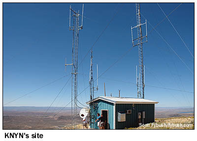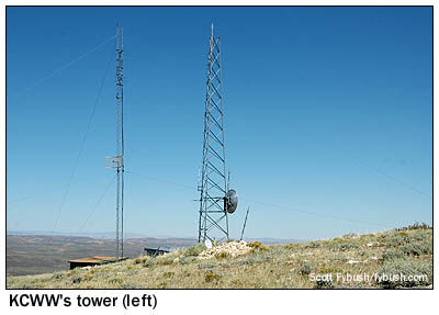 There's one more FM up on Medicine Butte: in 2005, KPCW added a rebroadcast signal up here. KCWW (88.1 Evanston) runs 92 watts from its two-bay directional antenna on the back side of the butte, providing a nice signal to Evanston and vicinity. 2010 update: Michael's now the morning man at KEVA - and KNYN has left the building. With the end of its LMA, it's now working on its Humpy Peak move-in, and KEVA has flipped from classic country to oldies. - Find out when the new Tower Site is posted,