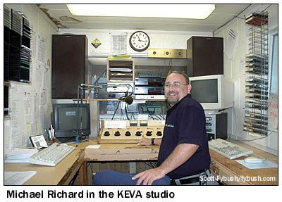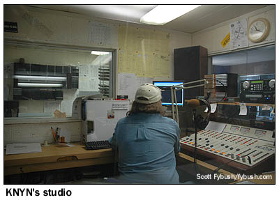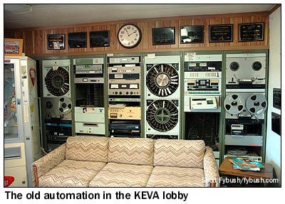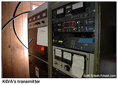 As we head inside, we're greeted by a nifty sight - one wall of KEVA's lobby is made up of nothing but equipment racks, most of them full of the remains of old automation equipment from KEVA and its former sister station, the old KOTB (106.1, now KBMG). Behind the racks, we find two narrow studios, one for KEVA and the other for its current FM sister, KNYN (99.1 Fort Bridger WY) - and behind those, we find the KEVA transmitter room, where the tubes on that McMartin transmitter sure do make a nice glow. (Did we mention KEVA is in beautiful-sounding AM stereo?)