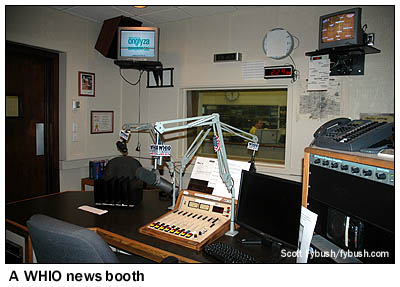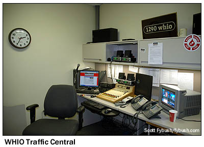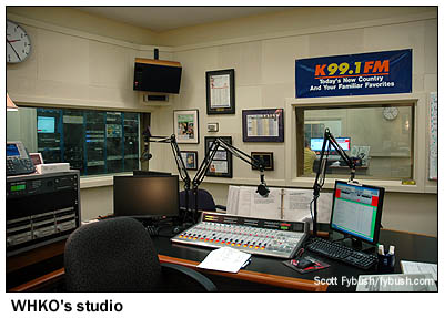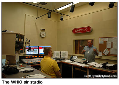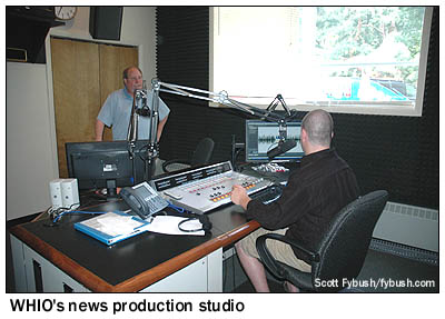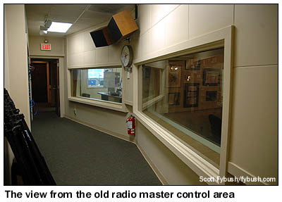 Cox added more FM signals, too: the classic rock simulcast of WCLR (95.7 Piqua) and WZLR (95.3 Xenia) joined the family in 1998; they later flipped to 80s pop as "The Point," WDPT/WDTP, and in 2006 the Xenia transmitter went back to being WZLR while the Piqua signal became WHIO-FM, a full-fledged FM simulcast of WHIO(AM)'s news and talk. By the time we dropped by in July 2010, WHIO and WHKO occupied those two big radio studios at the core of the radio side of the building, but the big windows to the left of the air talent no longer looked out into the radio master control area, as they did in the building's early years. That space had become a rack room, with engineering offices behind it.
