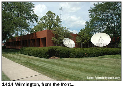 Over the years, the Wilmington Avenue building had grown considerably from its original size, which explains why the view from the street, shown at the top of the page, doesn't look anything like a 1949-vintage broadcast facility. (I believe that addition on the front of the building, which housed executive offices and a small lobby, dated to sometime in the early 1980s.) In later years, visitors to Wilmington Avenue walked past the base of the big self-supporting tower to enter the lobby, which in turn led into a large sales area that I think must have been where the original front entrance to the building was located. From there, a ramp led down past a showcase of WHIO historical material to the original radio studios - and to another corridor lined with more studios. The WZLR studio was back there, as were WHIO's traffic office, radio newsroom and another studio used for news production.