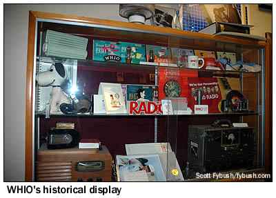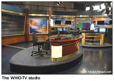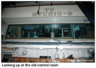 The original WHIO-TV studio from 1949 was still in use in 2010, though a corner of it had been walled off for use as a weather office. Back in the 40s and 50s, state-of-the-art TV studio design included a big window that looked down into the studio from the control room, and that window was still visible in WHIO-TV's studio, though much of the space up above had been partitioned off for storage and whatnot.