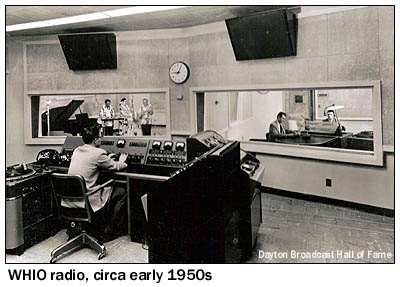 The studio with the piano in that view above, circa 1950, had become the WHIO air studio, while the studio on the right had become WHKO; another WHIO studio, used as a news booth and a talk studio, sat behind the main WHIO air studio, complete with heavy doors and vintage "on-air" lights.