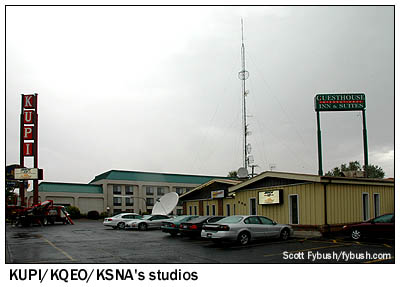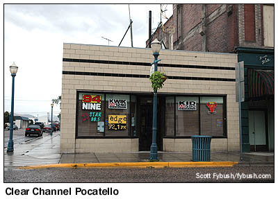 In any case, after stowing our gear at the motel and setting up the DVD recorders for one last evening of TV newscasts, we head out in the drizzle to see the radio and TV stations of Pocatello. (To Boston radio and TV fans, the city should be best known as the birthplace of WBZ-TV icon Jack Williams; inexplicably, there are no signs at the city limits announcing that bit of historic significance!) We'd actually passed the studios of NBC affiliate KPVI (Channel 6) and its Fox sister KFXP (Channel 31) as we stopped in Pocatello for gas a week earlier; the building at 902 E. Sherman is pretty hard to miss, being just a block or so from Business I-15 through the east side of downtown. Just a few blocks to the south, at 259 E. Center Street, we find Clear Channel's outpost in the market. This little building started out as home to KWIK (1240 Pocatello), and now also houses classic rock KPKY (94.9 Pocatello) and hot AC "Star" KLLP (98.5 Chubbuck), as well as modern rock "Edge" KPPC (92.1 Pocatello), which Clear Channel operated as an LMA, but which Peak Broadcasting bought outright after picking up the Clear Channel stations a few months after our visit. And further blurring those market lines, there are also signs out front for KID/KID-FM in Idaho Falls, which makes sense when you consider that KWIK and KID simulcast anyway.