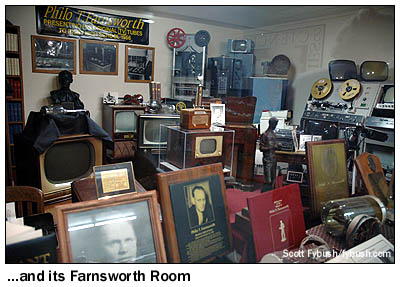 You probably know the, er, "Rest of the Story" - Phil was Phil Farnsworth, or "Philo T.," to give his full name, and he'd go on to be the first to demonstrate a working electronic television system, then get his spirits crushed by a patent battle with RCA and die in obscurity (or at least in Fort Wayne, if that makes any difference), only to become the hero of a Broadway play that would open and close later in 2007 to critical acclaim but little box-office action. And while Farnsworth would fade from public attention, those same folks in Rigby who wouldn't give him the time of day 80-some years ago now revere him as a local hero and tourism magnet. There are signs along US 20 proclaiming the town the "birthplace of television," and the county history museum is now the "Farnsworth TV & Pioneer Museum." In there, among the rooms decorated by historical societies in each of Jefferson County's small towns, there's a room filled with a very miscellaneous collection of old TVs, Farnsworth photos, and some retired gear donated by the local TV stations. While Philo didn't come back here much, his widow, Pem, returned to dedicate the room a few years back, and her picture is prominently displayed. This area north of Idaho Falls has two AM stations of its own: up in Rexburg, another 12 miles up US 20, KRXK (1230) relays Pocatello's ESPN Radio outlet, KSEI (930). (We actually saw this one eight days earlier, on the way from Salt Lake up to Bozeman.) And just east of Rigby, we find the tower of KIGO (1410 St. Anthony), one of several Spanish-language stations in the market.