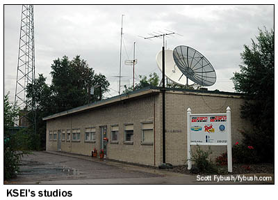 A thick tangle of railroad tracks separates this part of Pocatello from the city's west side, and crossing to the west takes us past the Idaho Wireless stations at 436 N. Main - country "Cow" KOUU (1290 Pocatello), country KZBQ (93.7 Pocatello) and hot AC "Core 104" KORR (104.1 American Falls) - and the Pacific Empire cluster a block away at 544 N. Arthur - sports KSEI (930 Pocatello) and classic rock KMGI (102.5 Pocatello). Here, too, the lines with the Idaho Falls market blur, since the sign out front also mentions KSEI simulcast KRXK (1230 Rexburg), as well as Idaho Falls FM signals KGTM 98.1 and KBJX 106.3.