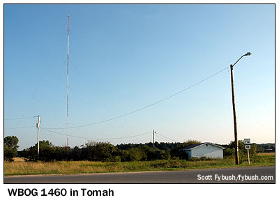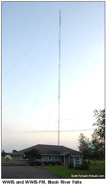 The calls stand for "Radio Juneau County," the adult standards AM (500 watts by day, 27 watts at night) dates to 1962, and its adult contemporary FM counterpart signed on in 1976. The AM tower is right next to those Fairway Lane studios (yes, there's a golf course around the corner), and the studios in turn look to have been built inside of a fairly sizable house, garage and all. We didn't make it over to the FM tower, a few miles west of Mauston, but if we had, we'd have seen an extra FM antenna: like so many small-town AMs these days, WRJC now has an FM simulcast of its AM, W225BF (92.9), and when we pass by they're busily engaged in the "WRJC Shopping Show," heard every Tuesday and Wednesday afternoon and Saturday morning. It's a quick 20-mile ride up I-90/94 to the next sizable town, Tomah, which sits right at the junction where 90 (coming east from South Dakota across southern Minnesota) meets up with 94, heading east and a bit south from its long run through North Dakota and the Twin Cities. (Digressing to roadgeekdom for a moment, I'm quite sure there's no other pair of interstates that converge and then separate again as often as 90 and 94 do; they part ways in Montana, rejoin here at Tomah, split again in Madison, where 90 heads south for Rockford and 94 east for Milwaukee, rejoin in Chicago, then split again for good in northern Indiana.) In any event, Tomah is home to two FMs and an AM, but with darkness now approaching, we have time only for the AM entry, WTMB (1460), which sits near the county fairgrounds just southeast of downtown. We've got time for one more stop before nightfall, and that's 30 miles north of Tomah along I-94 in Black River Falls, where WWIS (1260) and WWIS-FM (99.7) share a small building at the base of a tall tower on Town Creek Road, just west of the highway and just north of the town itself. The AM (580 watts day, 33 watts at night, adult contemporary) signed on back in 1958, while the FM (a 25-kw/328' C3 classic country outlet) is another fairly recent drop-in, circa 1991.