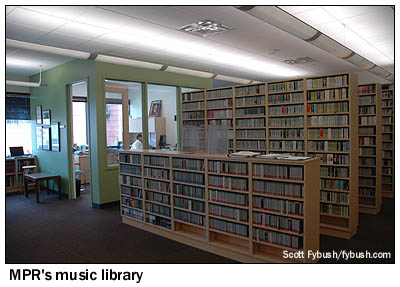 Here, too, there's a studio core that faces both the atrium (where there's a neat little nook with sofas and a wall of LPs, which sometimes get airplay on specialty shows) and a large office area for music hosts and producers. At the far north end of the office area we find one of the nicest music libraries we've ever seen. And before we move on, note the flatscreen monitor to the right of the classical studio's window. There's one of those next to every studio in the building; they're part of a neat internal network that schedules studio usage and displays exactly what's supposed to be going on in each studio at all times.