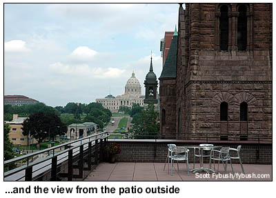 Up on the fifth floor is one of the most public spaces in the new building. The "IDS Forum" is a 100-seat lecture hall that's fully wired for broadcast; it's often rented out to community groups for meetings and presentations, during which we suspect many in the audience are just as interested in that nice view to the north through the glass wall behind the speaker's podium, across I-94 to the Minnesota state capitol a few blocks away. There's also a nice patio outside the wall, a pleasant place for lunch or a small meeting on a warm summer's day like this one.