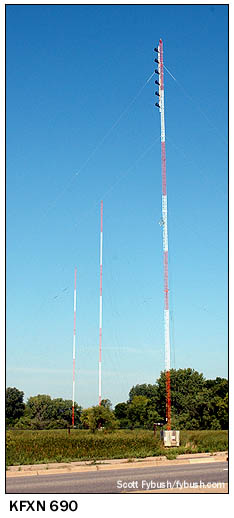 For whatever reason, the very low-profile little daytimer at 690 on the dial just slipped off our radar back then: not only did we fail to make a pass by its transmitter site in suburban New Hope, out to the northwest of Minneapolis, but we didn't even remember to grab an aircheck of its legal ID. We almost forgot it again in 2009 - except that on this trip, one of the non-radio items on the agenda was a visit to a family friend who lives out in that area - and as we were making our way out there, those three towers caught our eye and we stopped for a photo this time. This is a relatively new AM station, having signed on in 1962 as KTCR, the calls it would bear for several decades. Later known as KTCJ and KXBR, 690 eventually settled in as KFXN, a little sister station to the big Clear Channel sports-talker, KFAN (1130).