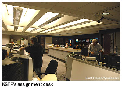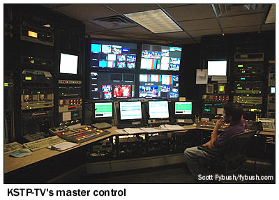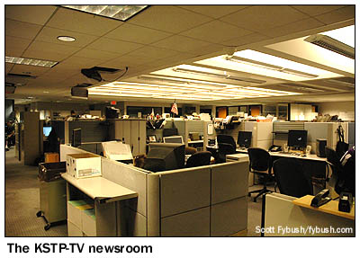 Most of KSTP-TV's technical plant (and that of its independent sister station, KSTC-TV 45) is downstairs from the lobby, and it's here that we find a shared master control for the stations, a rack room that's in the process of renovation, and a busy newsroom that's hard at work on the midday news when we stop by.