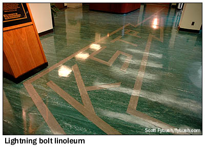 Check out that lovely lightning-bolt logo in the linoleum on the lobby floor, which I think is original to 1948. From here, separate hallways lead to the TV side, under the big "KSTP" letters on the Minneapolis side of the building, or to the radio side facing St. Paul.