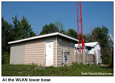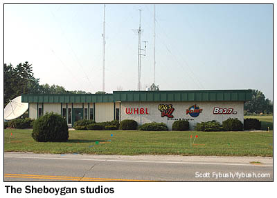 Our first stop is in a corn field about halfway between Manitowoc and Two Rivers, and it's here (after wading across a shallow creek) that we reach one of the newer signals in the market. WLKN (98.1) is licensed to Cleveland, Wisconsin, where it signed on in the mid-80s as WKTT on 103.1. (It moved to 98.1 in 1993 to get out of the way of a new signal over in the Appleton market to the west, where WOGB now occupies 103.1.) Today it's AC "Lake 98.1," and just after our visit in the summer of 2009, WLKN became part of the Seehafer Broadcasting family along with WOMT and WQTC, with studios up in Manitowoc. As for the local commercial radio scene in Sheboygan itself, it's dominated by Midwest Communications, which operates a cluster of three FMs and an AM out of studios on the south side of town. The three-tower directional array behind the building belongs to the city's oldest station, WHBL (1330), which traces its heritage all the way back to 1928; it's now accompanied here by two class A signals, WBFM (93.7) and WHBZ (106.5). WBFM was the original WHBL-FM on 97.9, later known as WWJR; it shifted from 97.9 to 93.7 to make room for WLKN in 1993, with the WWJR calls then moving from 93.7 to 106.5 when that new signal (licensed to Sheboygan Falls) launched in 1997. Today, 93.7 is country "B93.7," 106.5 is active rock "the Buzz" and a fourth station with studios here, WXER (104.5 Plymouth), does hot AC as "The Point," using a 96.1 translator here in Sheboygan for better city coverage.