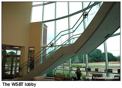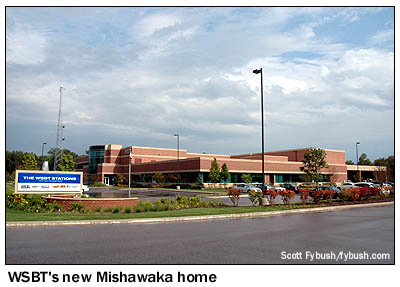 In last week's installment of Site of the Week, we presented the "before" half of the big move that Schurz Communications' radio/TV cluster in South Bend, Indiana made in 2009 - and one of the great things about being in northern Indiana as often as we get there is that we've had the chance now to make two visits to see the "after" side of the move. When Schurz moved its stations (CBS affiliate WSBT-TV, news-talker WSBT 960, AC "Sunny" WNSN 101.5 and the studios of WHFB-FM 99.9, a Benton Harbor, Michigan station operated under LMA by Schurz) out of downtown South Bend, it opted for a new home at a considerable distance: a piece of land adjacent to the Edison Lakes office park on Douglas Road in Mishawaka, five miles and about a 15-minute drive away from the old downtown location. The new facility was designed from the start to remedy many of the problems at the old downtown site: at some 85,000 square feet, it's more than twice as large as the old building, with plenty of parking and easy road access to both South Bend and the neighboring city of Elkhart.