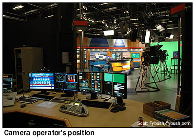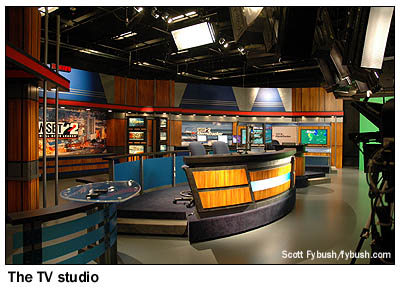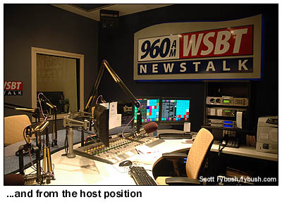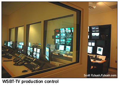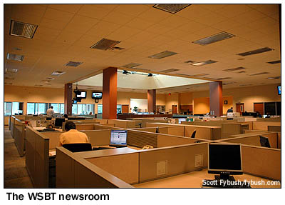 This newsroom was designed from the start to provide space for news staffers across several Schurz media outlets: not just WSBT-TV, but also the news staff for WSBT radio, the Mishawaka/Elkhart reporters for the Schurz-owned South Bend Tribune and the stations' and paper's website all operate from this room, which is drenched in light from windowed offices around its rim and from a big skylight up above the assignment desk. There's a studio off to the side of the newsroom for WSBT radio newscasts - and instead of the roundabout hallway journey from the old TV newsroom to the TV studio downtown, the new TV studio is located directly adjacent to this newsroom. It's been quite a transition for WSBT's staff and management, but they're settling in nicely and enjoying one of the most sophisticated broadcast facilities in the state - and we hope you've enjoyed your look inside, too! - Find out when the new Tower Site is posted,