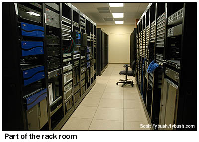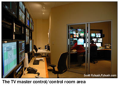 The cramped old rack rooms upstairs at the downtown building have been replaced by a spacious tech center full of both radio and TV equipment, centrally located between the radio and TV sides of the new facility.