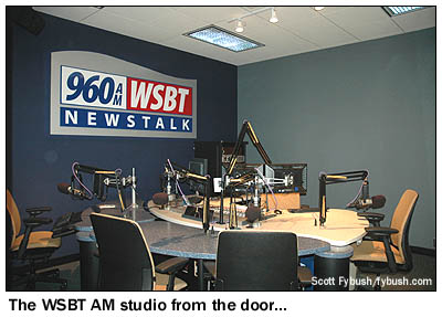 Like the old facility, the new building puts most of the radio operations in a separate area from TV; in this case, off to the left as we head into the building from the lobby. But while the old radio studios were jammed into a corner of the downtown building, the new studios are spacious and light-filled, with big glass windows looking out to the main radio hallway. They're color-coded, with Sunny getting a bright orange wall and WSBT(AM) decorated in blue and gray.