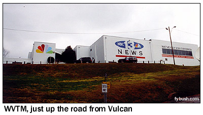 ![]() And in the middle, in the distance, are two more towers. On the left is WBRC-TV, channel 6, Birmingham's second TV station. Side-mounted on that tower are PBS outlet WBIQ (channel 10), public radio WBHM (90.3) and WBPT (106.9), the onetime WBRC-FM. Just beyond WBRC, to the right, is NBC affiliate WVTM, channel 13, with WYSF (94.5) mounted below. WBRC signed on from here in 1949, with NBC and DuMont programming on channel 4; it moved to channel 6 in 1953 and picked up CBS the following year. In 1961, WBRC became an ABC affiliate, and held on to the network until 1996 - when the station wound up in the hands of Fox Television Stations, which flipped it to the Fox affiliation it holds today. Can you name another station that's been a primary affiliate of five different networks? We can't... (WBRC's 1996 flip left ABC without a Birmingham home, and rather than affiliate with the former Fox affiliate, WTTO, the network hooked up with Allbritton Communications, which bought WCFT and WJSU, put WBMA-LP on the air and gave the city what's turned into a fairly successful new station, expanding the market for everyone else in the process.) ![]() ![]() Next door to WBRC's Southern-style studio (look familiar? WBRC, like Atlanta's WAGA, was once a Storer television station, and that's how Storer built its buildings) is the big, blocky home of WVTM, channel 13. This is the oldest station in town, having signed on a few months before WBRC as WAFM-TV, a CBS/ABC affiliate. WAFM became WABT in 1953, then picked up NBC when WBRC went to CBS in 1954. And in 1958, it changed calls to match its sister AM station, Birmingham's oldest radio station, WAPI (1070), becoming WAPI-TV. (At the same time, the former WAFM-FM became WAPI-FM on 94.5; it's now WYSF and is still on the channel 13 tower!) WAPI-TV became WVTM in 1980, "TM" for Times Mirror and "V" for Vulcan, as in the huge statue that perches on a tall pillar just down the road from channel 13. (He was off the pillar, being restored, when we visited). By 1994, WVTM was owned by a company called Argyle Broadcasting, which was eventually absorbed into New World Broadcasting - which already owned WBRC (and which would eventually be purchased by Fox, triggering all those affiliation changes in Detroit, Kansas City, St. Louis and so on) and thus couldn't hang on to two stations in the market. So in 1996, WVTM (and sister station KNSD in San Diego) were sold to NBC itself, creating two owned-and-operated stations up here above Red Mountain. 2011 update: NBC sold WVTM to Media General in 2006. Vulcan has long since been restored to his pillar. Troy has moved on, and is now director of engineering for Cumulus in Nashville. And Red Mountain has picked up some new FM tenants in the years since we visited: Cox's 97.3, now country WNCB, is up here now. And two more FM signals have joined it there, too, but we'll pick up that thread in a moment... One last bit of Red Mountain trivia: From the city side of the mountain, the big red "WBRC" letters are still a landmark, overlooking town from the back of the WBRC facility. We're told that WBRC and WAPI once shared the sign: it would flash back and forth between "6 WBRC" and "13 WAPI," with half the sign on the WBRC property and half on the WAPI property! Now that's cooperation...