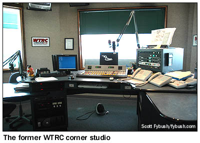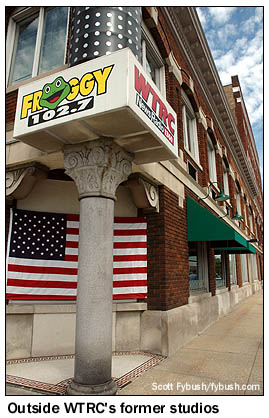 On this June day in 2008, however, Federated Media's WTRC (1340 Elkhart) and WLEG (102.7 Ligonier), were still operating from the corner of South 2nd and West Marion Streets, under the giant plastic microphone that adorned the corner of the building that's also home to the Elkhart Truth and the parent company of the stations and the newspapers, Federated Media. WTRC was then doing Elkhart-focused news and talk, while WLEG was and is an AC station branded as "Froggy 102.7." (The callsign has a double meaning - it stands for the three big communities the station serves, Ligonier-Elkhart-Goshen, and it's a play on "frog's leg," too!) While the studios were visible from the street corner (at least when that big flag wasn't covering the main WTRC studio window), the access was actually from down the block at the main Truth entrance, then through a warren of offices that led to the studios - WTRC right on the corner, WLEG tucked away inside. By 2010, WTRC had gone through something of a format flip, retaining its news-talk programming but losing its Elkhart focus as it moved to Federated's "Planet Radio" hub down the road in the South Bend suburb of Mishawaka. And by then, it had become an AM adjunct to WTRC-FM 95.3, licensed to nearby Niles, Michigan, the South Bend end of what had become "95.3 MNC, Michiana's News Channel." We'll visit Planet Radio and track that end of the story in next week's installment. Meanwhile, WLEG has moved to new studios in Goshen, which we haven't seen yet. (Perhaps this summer...)