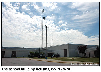 After our visit to WTRC, WLEG and the Truth, we head out to the northwest side of Elkhart, where the local school system operates the Elkhart Area Career Center, which was also home at the time of our visit to two public broadcasters: schools-owned WVPE (88.1 Elkhart) and the region's PBS outlet, WNIT (Channel 34/digital 35). We were eager to get a peek at WNIT's operation here because it was already on the way out by the summer of 2008: as you know if you've been following our South Bend segments, Schurz Communications' WSBT donated its former home in downtown South Bend to WNIT, and by mid-2010 the public TV station had vacated its space here in Elkhart in favor of a new state-of-the-art facility in the old WSBT space. (WNIT had been through quite a lot of adventures on its way there: its administrative offices in a set of mobile buildings next to the career center were destroyed in a fire in early 2009, forcing the offices to move to temporary space in downtown Elkhart until the South Bend building was ready; meanwhile, its analog transmitter failed in early 2008, making WNIT one of the first full-power TV stations to go digital-only, a year ahead of the official transition.)