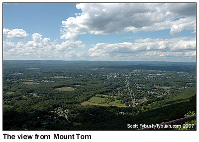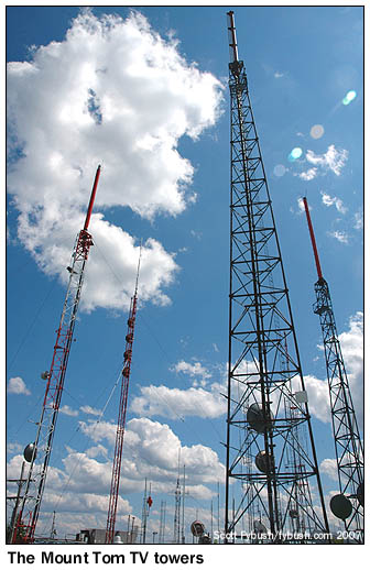 As Mike noted a few days ago, there's never been much here on Site of the Week from the market where he got his start in the business, and with Springfield, Massachusetts having been so much in the news lately after being hit by tornadoes, it's time to do some rectifying. And there's no better place to start than atop Mount Tom, 1200 feet above sea level and about a dozen miles north of downtown Springfield. This site isn't just one of the highest peaks in the area, it's also beautifully situated to look both south into the Springfield/Chicopee/Holyoke metro area and north up the Pioneer Valley into Northampton, Amherst and beyond.