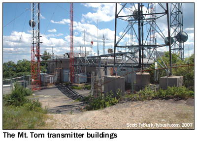 Holyoke-licensed WHYN-FM (93.1), Chicopee-licensed WACE-FM (100.5) and Springfield-licensed WMAS-FM (94.7) boasted of a shared transmission facility, though it didn't last long - WACE-FM quickly went away and WMAS-FM eventually moved to a new site atop the WMAS (1450) tower near downtown Springfield. But WHYN survived up here, and soon added a TV outlet: WHYN-TV signed on here in 1953 on channel 55 as one of two TV stations to debut in Springfield that year (we'll see the other one in next week's Site of the Week installment), and it was a CBS affiliate for its first five years on the air, switching to ABC in 1958 when Hartford's new WTIC-TV (now WFSB, channel 3) took over CBS for the region. The next station to arrive up here was WGBY-TV (Channel 57), Springfield's PBS station, which signed on in 1971, and in the years since only three more signals have been added up here: a second FM, WVEI (105.5 Westhampton) in 2007 and two low-power TV stations, WFXQ-CA (Channel 28) and WSHM-LP (Channel 67) in the last decade or so. Our pictures come from two trips up the mountain in 2006 and 2007, in the midst of the DTV transition and just as WVEI was being built, and we'll have more to say about both situations as we continue. First, the geography: with the exception of WFXQ-CA, all the transmitters on the mountain are tightly clustered in a fenced-in area toward the southern edge of the ridge that makes up Mount Tom, on a plateau where a resort hotel once sat. (Hikers approaching the site and a nearby overlook get to walk up some of the concrete steps that once formed the resort's porch, where vacationers enjoyed a commanding view of the Pioneer Valley to the north.)