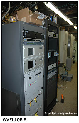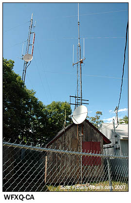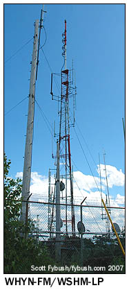 (After transition, WGBY had to change channels, since both 57 and 58 are out of core; it ended up on channel 22, the former RF home of NBC affiliate WWLP, and its old channel 57 antenna has been replaced by a new channel 22 antenna on the same tower.) The newest FM facility on the mountain was just being built during our 2006 visit. WVEI-FM (105.5) was the result of a shuffle that moved the former WBEC-FM license from Pittsfield more than 30 miles east to Easthampton, the very town in which Mount Tom actually sits. The WBEC-FM calls and "Live" top-40 format moved down the dial to 95.9, replacing the former WUPE-FM (its calls and oldies format in turn went to 100.1 in North Adams, replacing WMNB-FM there), and the new 105.5 in the Springfield market ended up in Entercom's hands as a simulcast of Boston sports-talker WEEI. The BE transmitter went into one of the oldest buildings up here, which I believe was actually originally a piece of the resort hotel's basement, and the Shively antenna went up on a telephone pole, seen at left in the right-hand picture at the top of the page. That leaves just one more site to examine, about half a mile north of the main transmitter compound along the Mount Tom ridge. WFXQ-CA (Channel 28, since converted to digital as WFXQ-CD) is a sister station to NBC affiliate WWLP, and while its calls suggest that it once was meant for a different fate (the Fox affiliation in town ultimately landed on "Fox 6," aka WGGB's 40.2 subchannel), WFXQ now provides a fill-in simulcast of WWLP to serve viewers in Easthampton and other areas shadowed from WWLP's main RF 11 transmitter on Provin Mountain...which we'll see next week. (The area where WFXQ is located is also where Clear Channel will soon be moving WRNX 100.9 Amherst, which currently transmits from a different site across the Connecticut River to the east. That site is accessible only by hiking; when it moves, WRNX will have an easier time reaching its site, not to mention better coverage into Springfield and vicinity.)