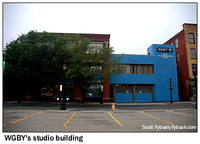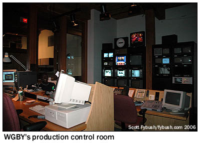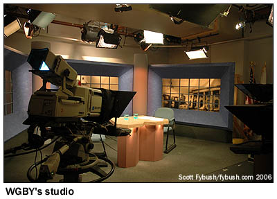 And we leave you this week with some studio pictures from our 2006 Springfield visit: We didn't get inside the WGGB studios on Liberty Street, which is something we'll have to rectify one of these days, since this facility goes way back to the days when the building near the Springfield/Chicopee line was home to both WHYN-TV and WHYN radio. But we did get to visit the Hampden Street studios of public broadcaster WGBY, in a beautifully-renovated turn-of-the-century downtown building that's had a very blue studio addition tacked onto the side of it.