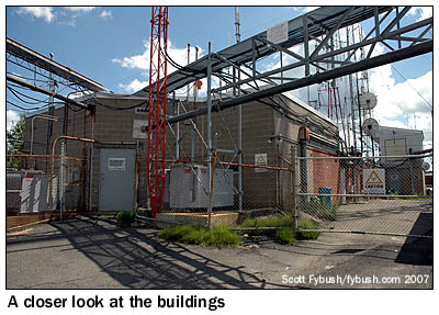 The gated road that leads up to the towers comes in from the north, and the first buildings and towers past the gate belong to the original tenants. The former WHYN-TV moved to channel 40 in 1959 and became WGGB-TV in 1980, and at least when we visited in 2006-07, it had two towers up here: a guyed tower (at left in the left-hand photo above) bearing the antenna of the interim WGGB-DT operation (ironically enough on RF channel 55) and a self-supporting tower with the channel 40 antenna, in the foreground of the left-hand photo at the top of the page.