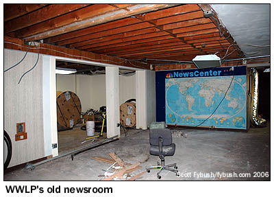 But the WWLP transmitter stayed put at Provin, and we've had the opportunity to go beyond the well-secured gates at the base of the mountain and visit the site on several occasions during the DTV transition - and now to share it with you. The old WWLP building was a classic example of "keep tacking it on" broadcast facility design: over the decades, it kept growing out and up as more space was needed, resulting in a charmingly tangled warren of half-stairways and small spaces that made it a unique place to work. At the front of the building was the newsroom, just beyond the main entrance, and just beyond it (behind the map wall that still survives a decade after the move-out) was the large main TV studio. The control rooms were off to the side, a flight up, and they'd been renovated (apparently in the 1980s) into a fairly modern suite that included a master-control facility, a big rack of microwave links (including a microwave connection to Boston to share video with sister NBC outlets WBZ and later WHDH-TV there) and, off to the side, enclosed audio and video control rooms for WWLP's newscasts.