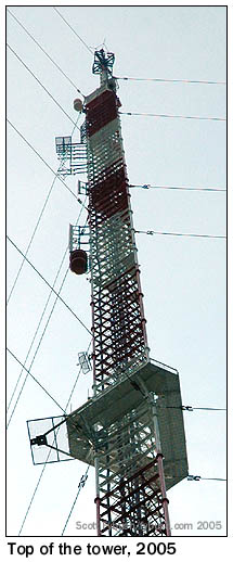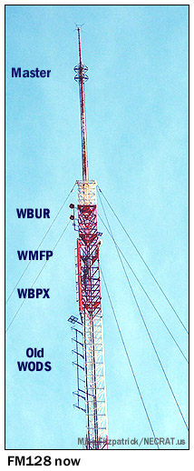 1082 feet to the top of the tower, 1252 feet to the tip of the antenna, this tower's history goes back to 1957, when it was built by the Boston Herald-Traveler newspaper to be the site of the city's third commercial VHF TV station, WHDH-TV 5, which signed on November 26 from the WHDH radio studios on St. James Street in the Back Bay (later moved to Morrissey Boulevard in Dorchester) and a transmitter right here where Newton meets Needham. From that day until 1972, this tower was home to just two stations: WHDH-TV and WHDH-FM 94.5, later WCOZ. (The FM had been on the air since 1948, transmitting from the old John Hancock building in the Back Bay.) And then, on March 19, 1972, WHDH-TV lost its fight to keep its license (a story documented extensively elsewhere). The Herald-Traveler had to give up the channel 5 license, but it was under no obligation to sell any of its facilities to the new channel 5, Boston Broadcasters' WCVB. So WCVB was forced to find new studios (in a converted International Harvester dealership just across 128 from here) and a new transmitter site (sharing an antenna with WBZ-TV at its Needham tower), and the old WHDH-TV tower was ready for a new life. With Boston's TV stations already accommodated at other locations (the candelabra, which had gone up in 1971, took care of UHF needs for many years), the future was in FM - and so it was that this tower became "FM128", a new home for many FM stations that had been at lower and less-desirable locations around the city. (WCOZ, which remained on the tower after its former TV sister went away, ended up in the hands of Sconnix Broadcasting, hence the "Sconnix Tower" name that was also in use here in the seventies and eighties.) During those years, WVBF (105.7) moved in from Framingham, WBOS-FM (92.9) from the candelabra, WBUR (90.9) from the Boston University Law School building on Commonwealth Avenue, WJIB (96.9) from the candelabra (where it had moved after relocating from its original site, Zion Hill in Woburn), WROR (98.5) from the channel 7 tower nearby, WCRB (102.5) from the nearby WBZ-TV tower in Needham and WEEI-FM (103.3) from its original tower in Malden.