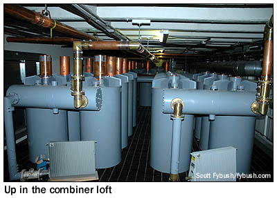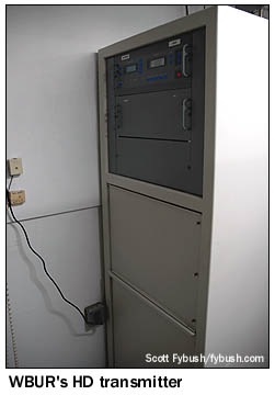 Today, those TV rooms (on the left in the photo above) are used for storage, but the tenant rooms across the hall remain in use for radio, while the spacious hallway provides storage for excess transmission line, combiner cans and antennas. (That red Shively radomes in the foreground of the photo above is part of the old WJMN antenna that used to be mounted near the base of the mast, and I think the ERI bays behind it were the old 98.5 aux antenna lower down on the tower.) Public station WBUR-FM (90.9) occupies the first room, shown above in 2005; in addition to the old blue BE unit that was the first WBUR transmitter to make the move from the Boston University campus out to FM 128 in the 1980s, there's a newer Harris solid-state analog transmitter, and our visit coincided with the installation of another Harris for WBUR's digital signal. WBUR is now the last remaining FM signal on this tower not to use the master antenna; because it's directional, it has its own separate two-bay antenna mounted near the top of the tower itself; in days gone by, as noted above, 94.5 used its own two-bay antenna near the base of the top mast, while 103.3 used a side-mounted Jampro that's now an aux; today, both 94.5 and 103.3 are on the two-bay ERI Cogwheel master antenna mounted near the top of the mast.