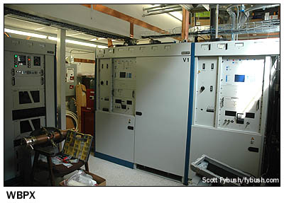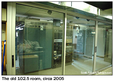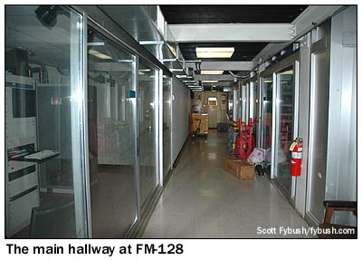 Continuing down that side of the transmitter hallway, the room that once belonged to WBOS (92.9) now houses auxiliary transmitters for several of Greater Media's stations: WBOS, WTKK (96.9), WROR (105.7) and WMJX (106.7) all make their main transmitter homes at the Pru these days, but all are backed up here. The last room in that row was, I think, once the home of 105.7 before its move to the Pru , but it was already changing when we stopped by in 2005. Back then, there were transmitters in the hall and the room was being refinished to become the new home of what was then WBMX (98.5); it wasn't long afterward that 98.5 came upstairs from its old room in the basement, and there it has remained through callsign and format changes that turned the signal into all-sports WBZ-FM (98.5 the Sports Hub).