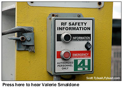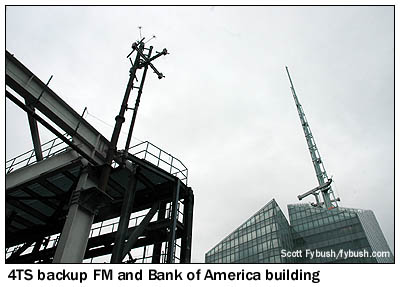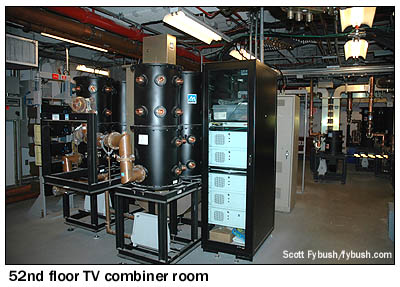 One floor down on 51, the FM combiner that served five stations in 2001 now serves 11 stations: it's an aux site for the original five Clear Channel FMs (WHTZ 100.3, WKTU 103.5, WAXQ 104.3, WWPR 105.1, WLTW 106.7); SBS' WPAT-FM (93.1) and WSKQ (97.9); public radio WNYC-FM (93.9) and WQXR (105.9); WKCR (89.9) and city-owned WNYE-FM (91.5). The Clear Channel, SBS and WNYC transmitters are in individual rooms that surround the combiner, while the WNYE room and the TV transmitters are one floor below, on the mezzanine floor that was built between the 49th and 50th floor as part of the broadcast expansion project. There's a particular bit of irony to go with WNYE's recent arrival as a tenant here: the FM station, then owned by the city schools, was the first one Lyons ever worked at, when he was a student at Brooklyn Tech in the sixties! (I'd love to show you those mezzanine rooms, but we weren't accompanied by engineers from those stations during this visit, so we'll have to find an excuse to come back sometime soon to continue profiling the newest additions to this site!) As it passes the ten-year mark, a lot has changed up here, but one thing remains the same: it's still the only multi-tenant broadcast facility in the city that was designed from the ground up for FM and TV transmission, and it remains a vital part of the radio and TV infrastructure in the nation's biggest market. Since the new skyscraper that's going up at the old World Trade Center site won't include broadcast facilities, it's still up to just two major sites, Empire and 4 Times Square, to handle the city's needs - and if the talk of a major reconstruction of Empire's mast ever comes true, it's likely that still more broadcasters will look to 4 Times Square to provide alternate transmission capability in the interim. ![]() - Find out when the new Tower Site is posted,