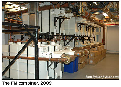 Inside we go - and we'll start on the top floor of the facility, the 52nd floor space that was largely empty the first time we came to visit. Today, the big space on 52 is filled with combiners for the TV tenants whose transmitters feed the antennas up above. There's just one station on the VHF antenna, ABC's WABC-TV (Channel 7); in the wake of the DTV conversion, the UHF combiners will end up being reconfigured for their digital tenants, Univision's WXTV (Channel 40) and WFUT (Channel 30) and city-owned WNYE (Channel 24). The 52nd floor is also home to a small rack of gear for WFMU-FM1, and to several racks of transmitter and processing for Columbia University's WKCR (89.9), one of two FM signals that use 4 Times Square as their primary site.